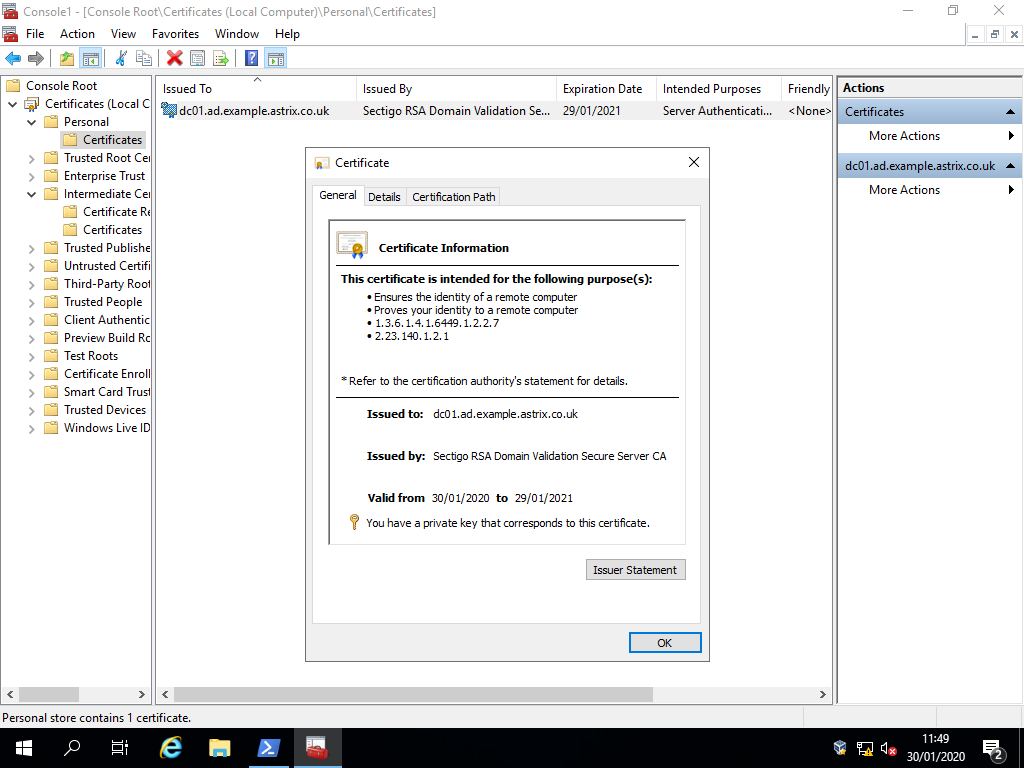 Certificate Domains, add the FQDN of the DC. For example,DC01.ad.example.astrix.co.uk.In the section