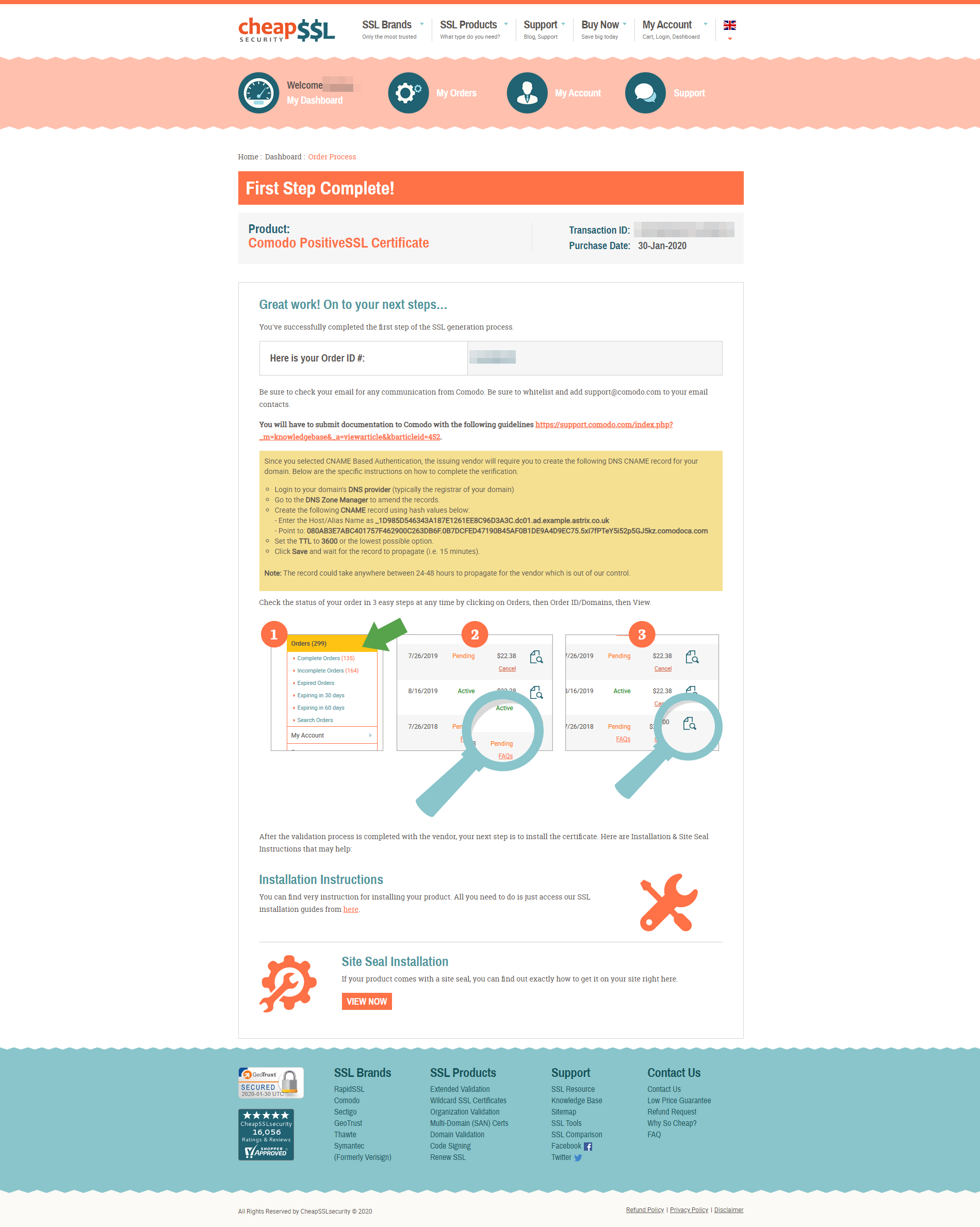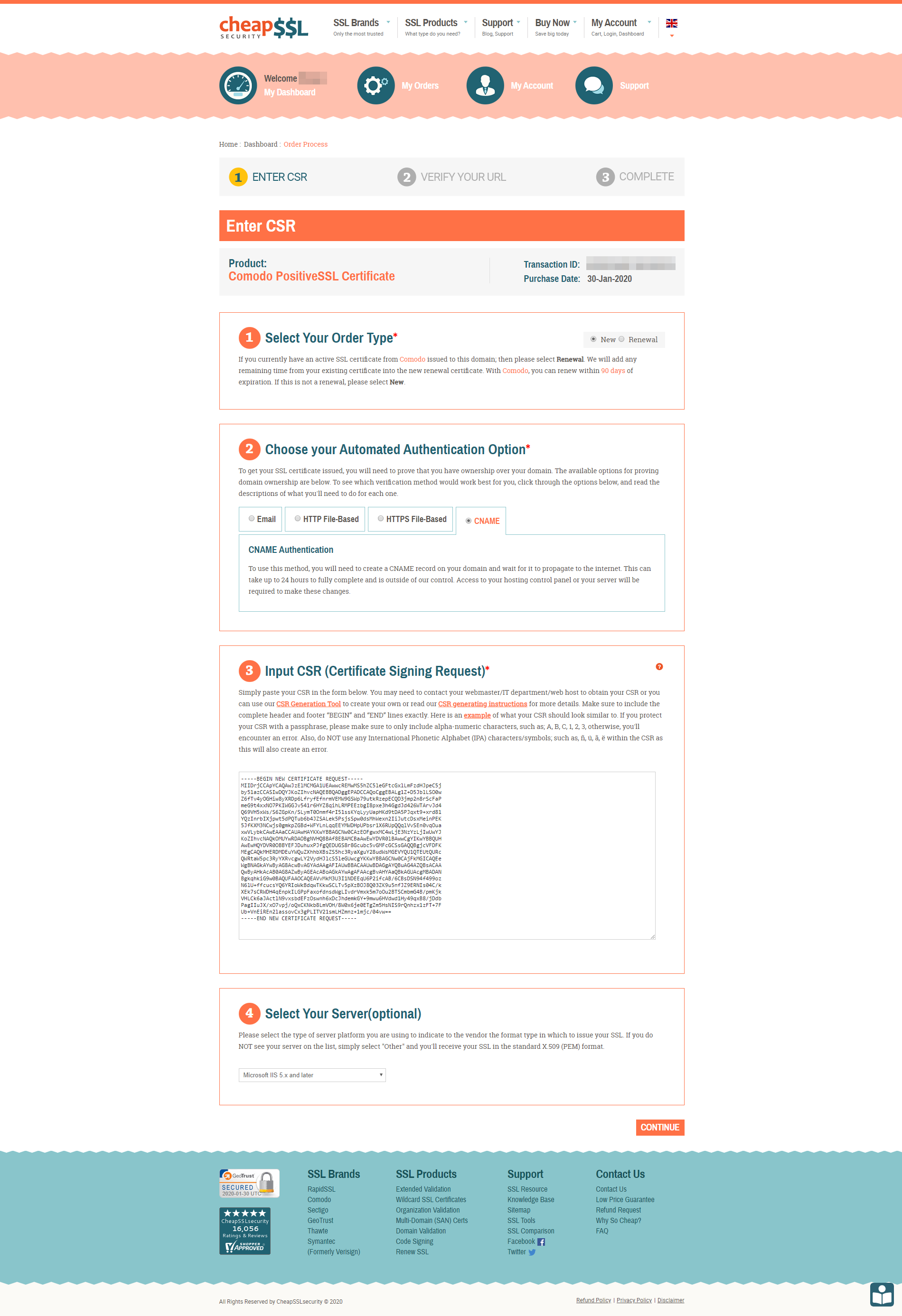 For demonstration purposes, we will be using a Comodo PositiveSSL Certificate via CheapSSLSecurity with domain validation via DNS.