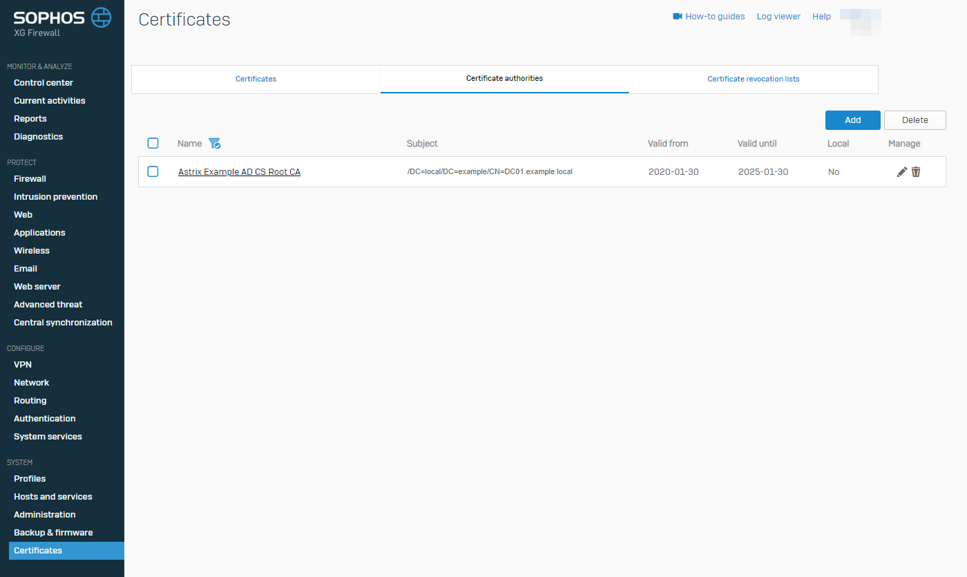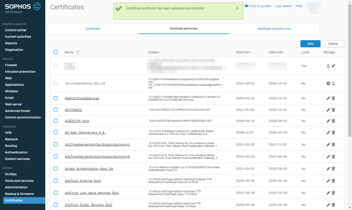 SYSTEM, select the tabCertificates→ select the tabCertificate authorities→ select the buttonAdd.Enter the following information: